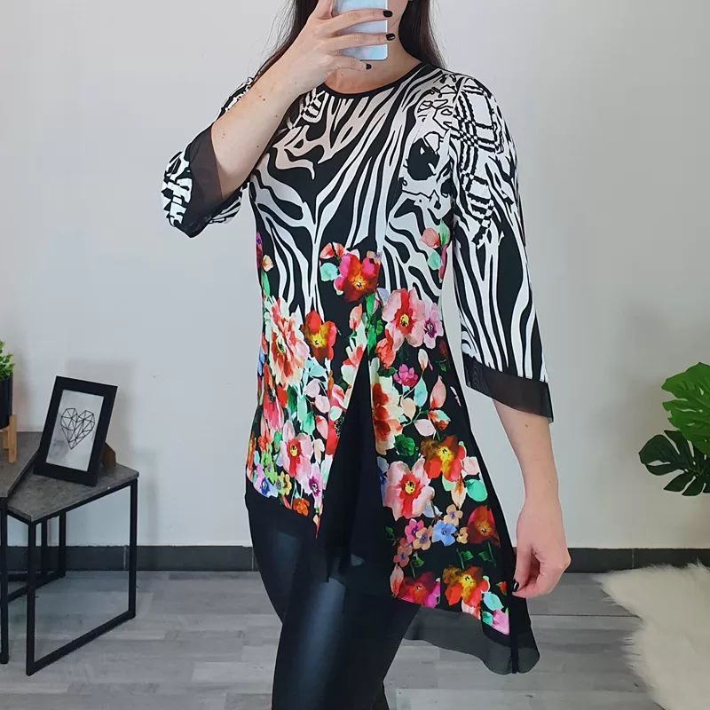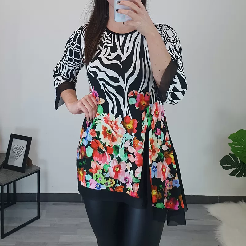 Tunika Mei s 3/4 rokavom. Tunika je s cvetličnim in črno – belim vzorcem, kombinirana je s tilom.