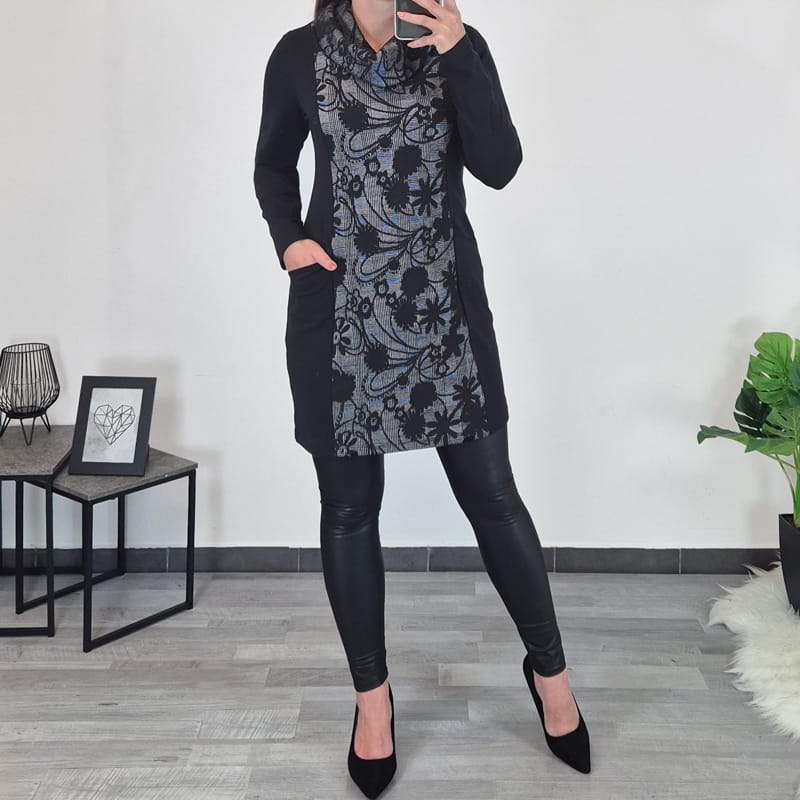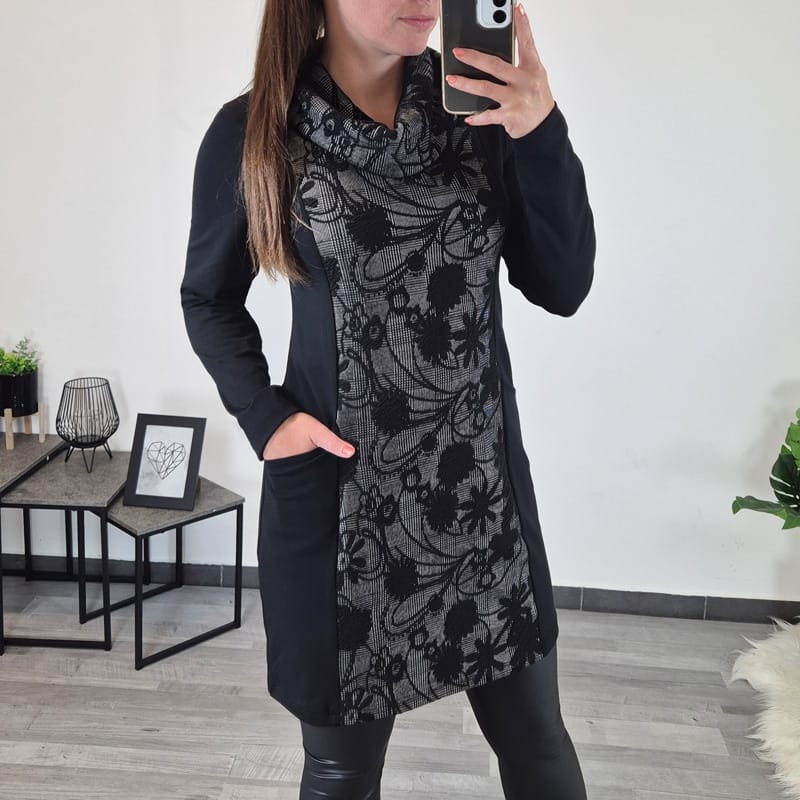 Ženska tunika Mera v črni barvi z visokim ovratnikom, ovratnik in srednji sprednji del tunike je kombiniran s črno sivim blagom z vzorcem cvetlic. Tunika ima žepe na levi in desni strani in ima dolga rokava.