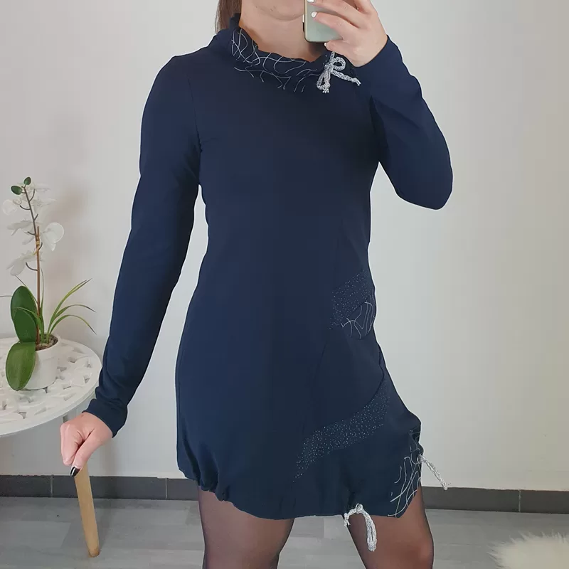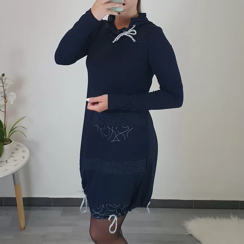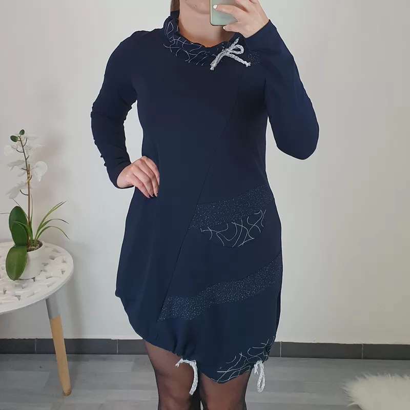 Modna asimetrična tunika Mihaela z dolgimi rokavi, v temno modri barvi. V predelu prsi je bolj oprijeta, nato pa krojena navzven. Na sprednji strani in ovratniku jo krasi tisk pikic in črt v srebrni barvi. Ovratnik z dodanimi vrvicami nastavite po želji. Prav tako so na koncu tunike dodane srebrne vrvice s katerimi poljubno oblikujete tuniko.
