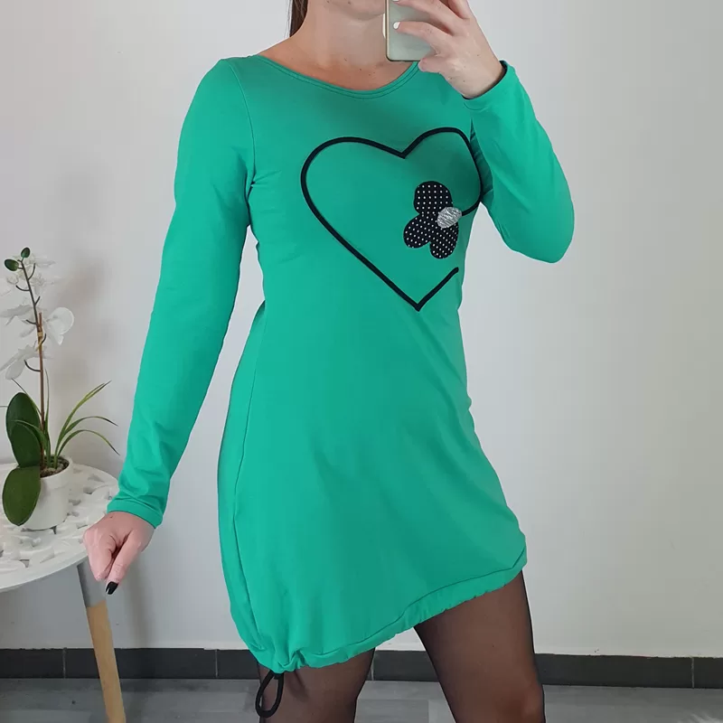 Modna bombažna tunika Monja v zeleni barvi. Tunika je izdelana iz kvalitetne mešanice bombaža in elastana, ter se lepo prilagaja telesu. Tunika je krojena na ‘balon’, na koncu je dodana vrvica s katero tuniko oblikujete. Na sprednji strani jo krasi srce in cvet v črni barvi.