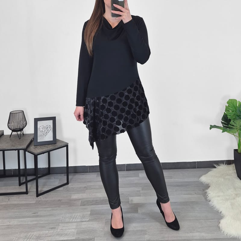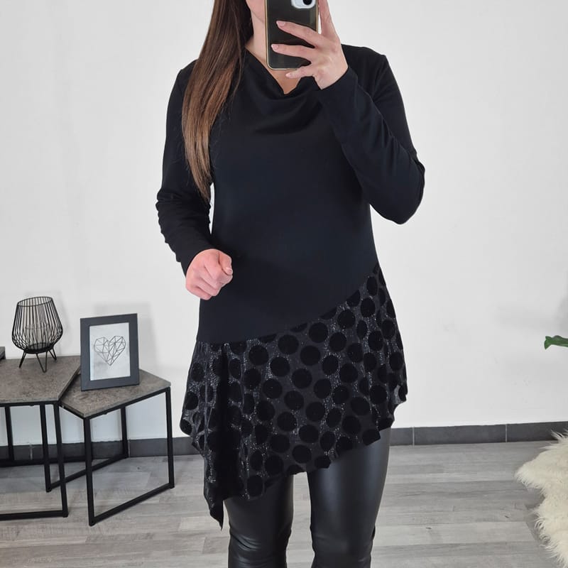 Elegantna tunika Naja v črni barvi. Tunika je na sprednji strani spodaj kombinirana s svetlečim blagom v obliki krogov. Ima nekoliko viseč ovratnik, dolga rokava, kroj je rahlo oprijet. Izdelana je iz kvalitetne viskoze in je prijetna za nošenje.