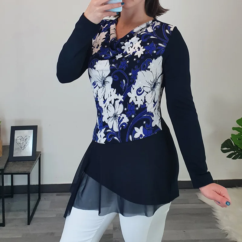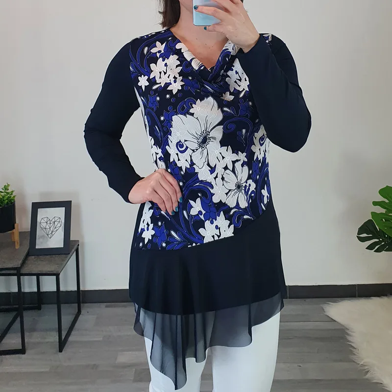 Elegantna tunika Naja v temno modri barvi. Tuniko na sprednji strani krasi cvetlični tisk v kombinaciji bele in modre barve. Ima dolga rokava, kroj je rahlo oprijet. Na koncu tunike je dodan til. Izdelana je iz kvalitetne viskoze in je prijetna za nošenje.