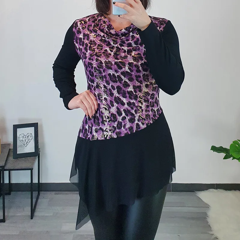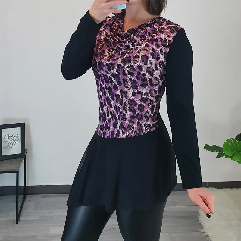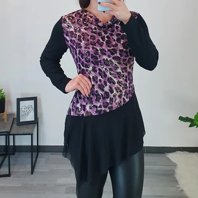 Elegantna tunika Naja v črni barvi. Tuniko na sprednji strani krasi blago z vzorcem v vijolični barvi. Ima dolga rokava, kroj je rahlo oprijet. Na koncu tunike je dodan til. Izdelana je iz kvalitetne viskoze in je prijetna za nošenje.