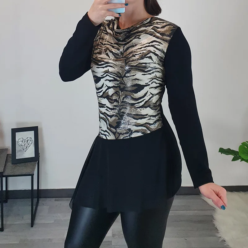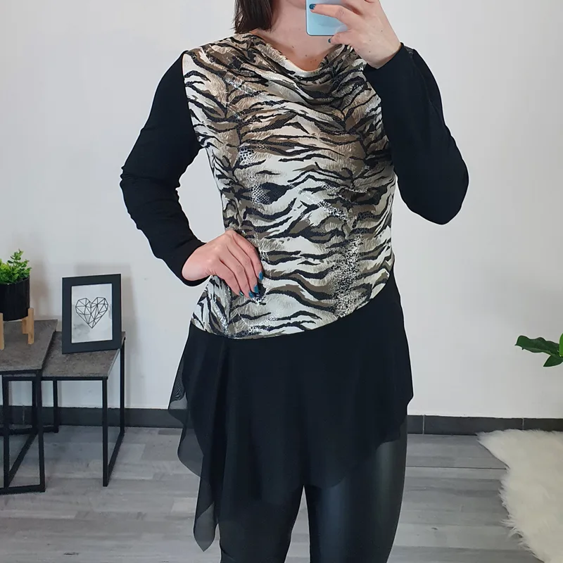 Elegantna tunika Naja v črni barvi. Tuniko na sprednji strani krasi blago z vzorcem v bež odtenkih. Ima dolga rokava, kroj je rahlo oprijet. Na koncu tunike je dodan til. Izdelana je iz kvalitetne viskoze in je prijetna za nošenje.