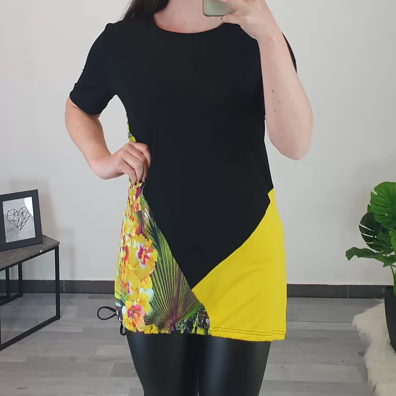 Modna tunika Nesa v črni barvi. Na sprednji strani jo krasi rumeno blago in blago s pisanim vzorcem. Na koncu tunike je dodana vrvica, s katero prilagodite širino. Izdelana je iz kvalitetne viskoze. Tunika, izdelana iz viskoze je zračna in prijetna za nošenje, poleg lepega leska pa jo odlikuje tudi to, da ‘lepo pade’, kot pravimo. Na voljo je od številke 40 do 50.