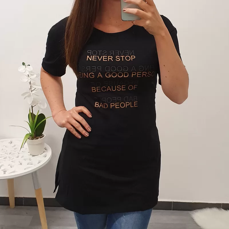 Tunika Never Stop s kratkimi rokavi v črni barvi. Majica ima tisk v zlati in črni.