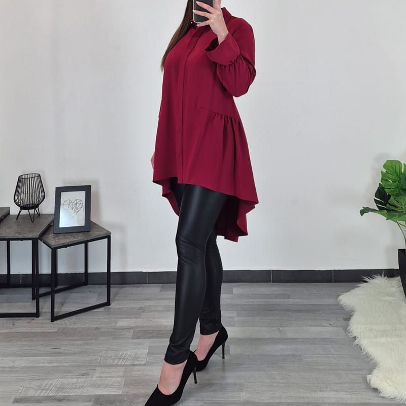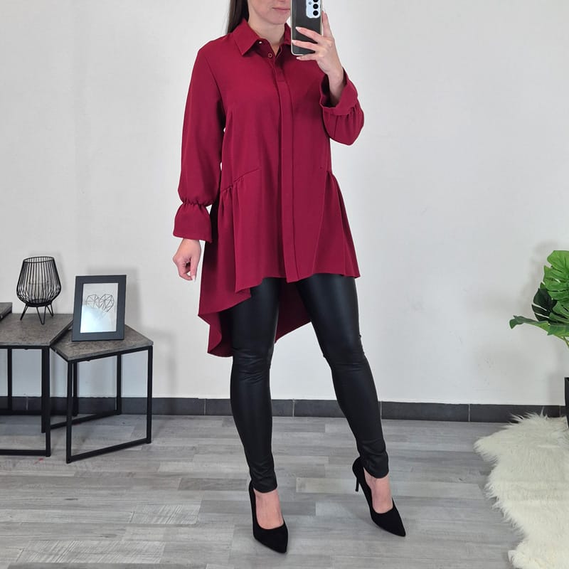 Modna daljša ženska tunika/bluza v bordo barvi. Bluza ima ovratnik, po celi dolžini se zapenja na gumbe, rokava so dolga, zaključena na patent z elastiko. Bluza je spredaj krajša. V višini bokov ima okrasni šiv z malimi gubami, kar ji da poseben izgled.