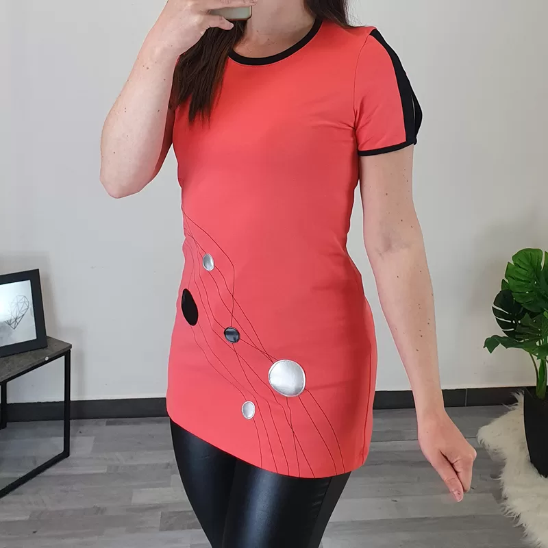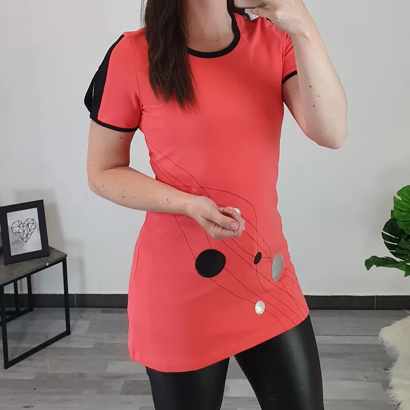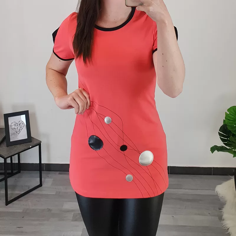 Modna ženska tunika Polonca v losos barvi. Tunika ima kratka, prerezana rokava s črno obrobo. Črna obroba je dodana tudi na ovratniku. Na sprednji strani jo krasijo črni in srebrni krogi ter črne črte. Izdelana je iz kvalitetnega bombaža in je prijetna za nošenje. Na voljo je od številke 36 do 50.
