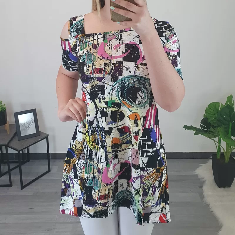 Modna asimetrična tunika Rija z vzorci v pisanih barvah. Tunika ima kratka rokava, na levi strani pa odprto ramo. V predeli prsi je oprijeta, nato pa je krojena navzven. Izdelana je iz kakovostne mešanice viskoze in elastana in je zelo prijetna za nošenje.