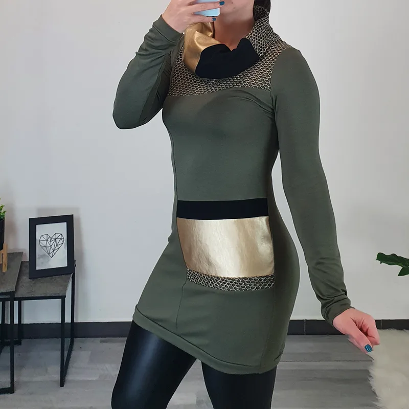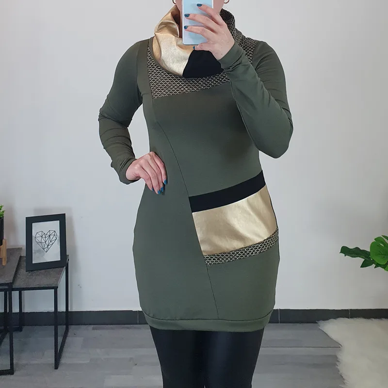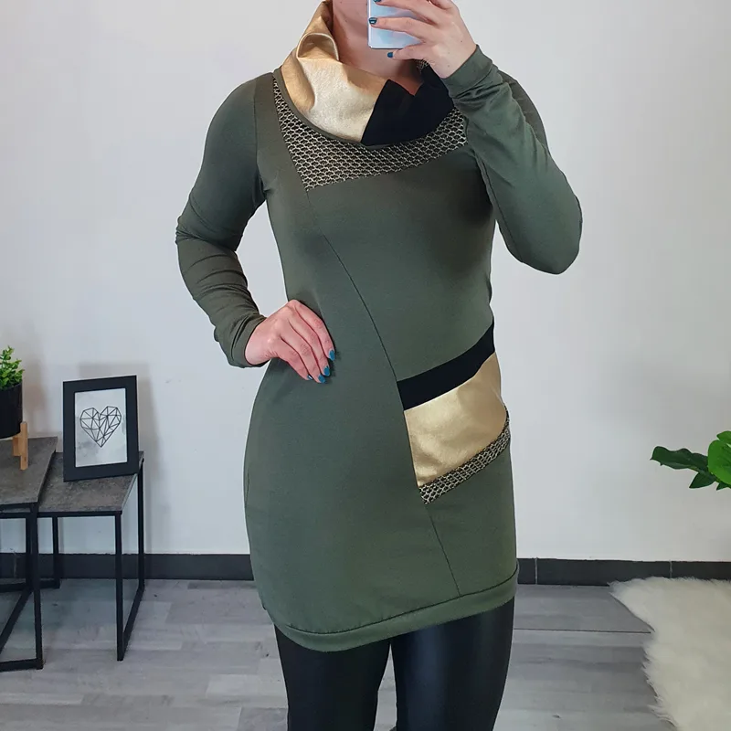 Modna tunika Renesa v olivni barvi. Tunika ima bogat viseč ovratnik, ki je kombiniran z blagom v zlati, zeleni in črni barvi. Za lepši izgled je na ovratniku in na sprednji strani tunike dodana mrežica v zlati barvi. Tunika ima dolga rokava, kroj je rahlo oprijet. Izdelana je iz kvalitetnega bombaža in je udobna za nošenje. Na voljo je od številke 36 do 50.