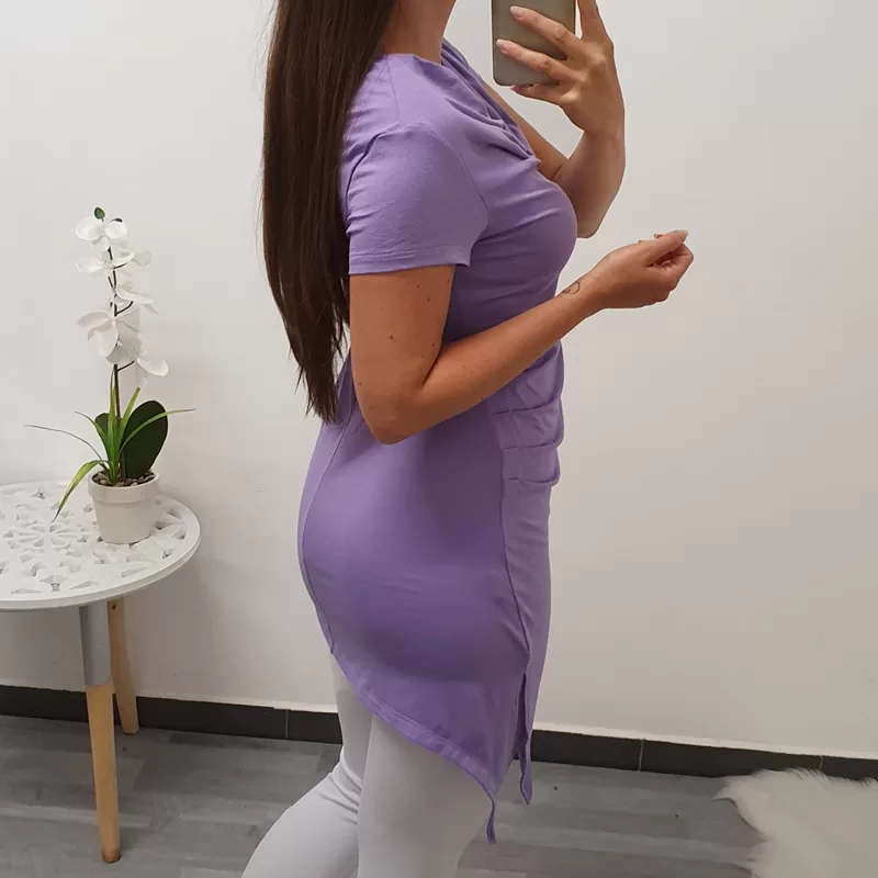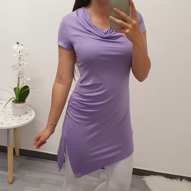 Tunika Romina v nežno vijolični barvi. Tunika ima kratka rokava in nabran ovratnik. Kroj je asimetričen, na levi – daljši strani je ob straneh dodan še razporek.