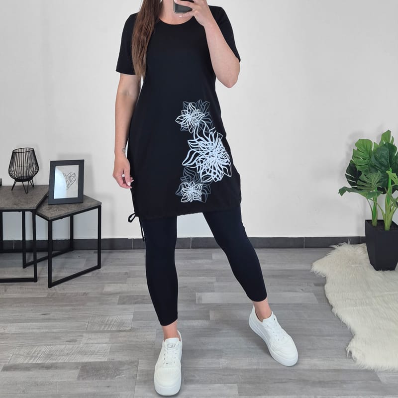 Modna bombažna tunika Roža v črni barvi. Tunika je izdelana iz kvalitetne mešanice bombaža in elastana. Ima kratka rokava. Tuniki je na koncu dodana vrvica, s katero lahko nastavite širino po svoji želji. Na sprednji strani jo krasi tisk belih rož. Kroj tunike je primeren za vse postave, tudi za močnejše, saj je na voljo do številke 52.