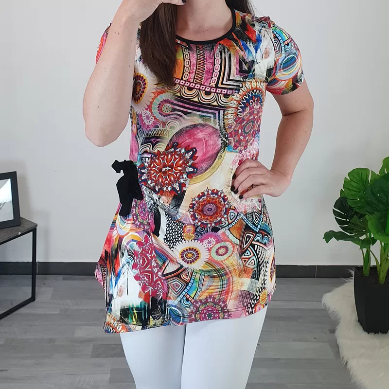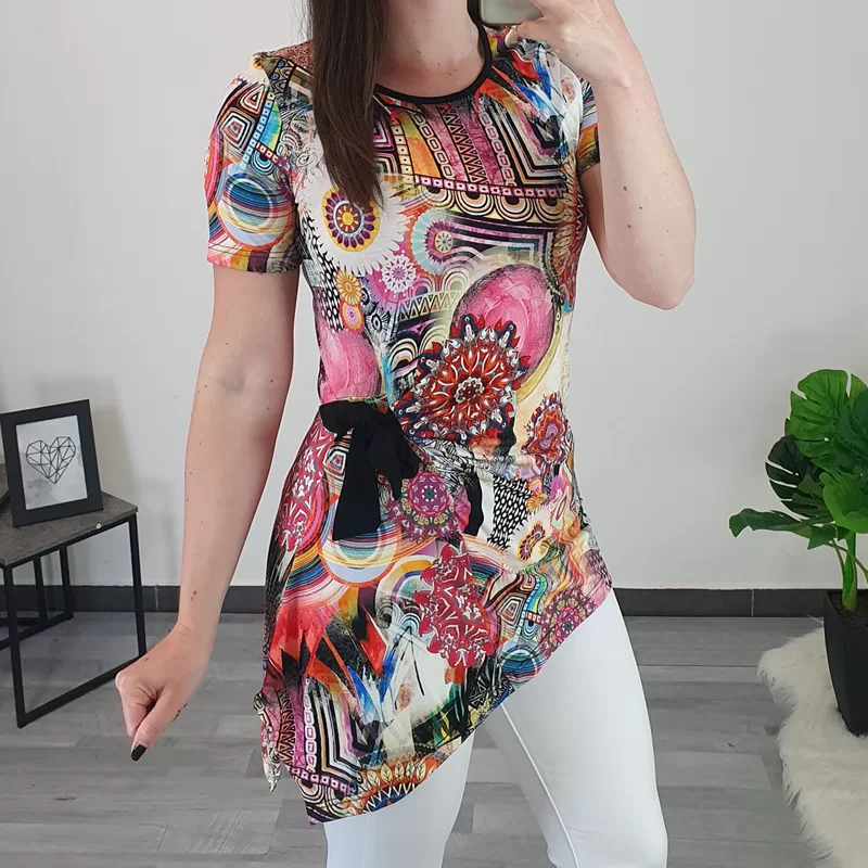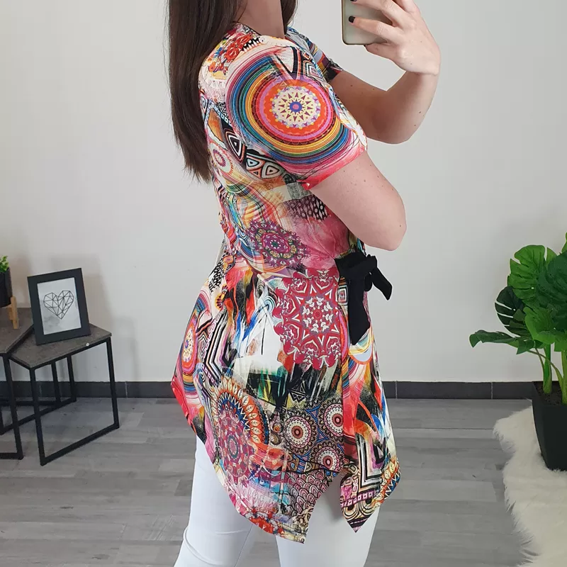 Modna ženska tunika Sava je narejena iz vzorčastega materiala, vzorec pa je sestavljen iz različnih barv. Ima kratka rokava, kroj je asimetričen, na levi sprednji strani pa je dodan črn trak, s katerim tuniko stisnete. Črna pentlja ji daje zanimiv izgled. Izdelana je iz kvalitetne mešanice viskoze in elastana. Na voljo je od številke 36 do 50.
