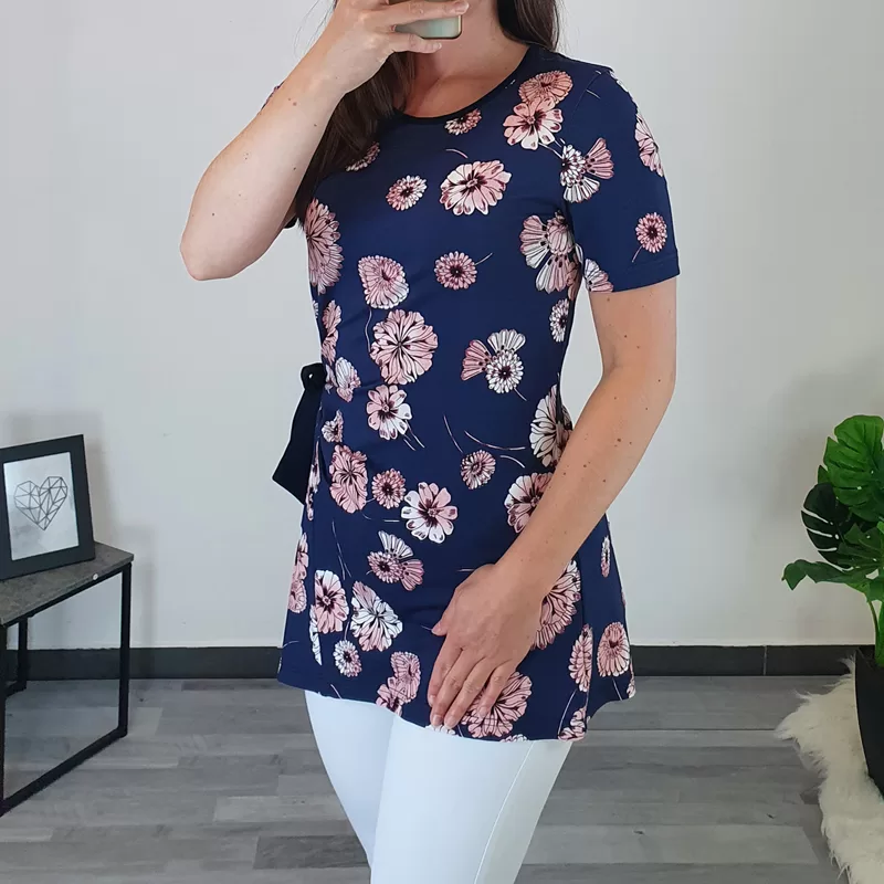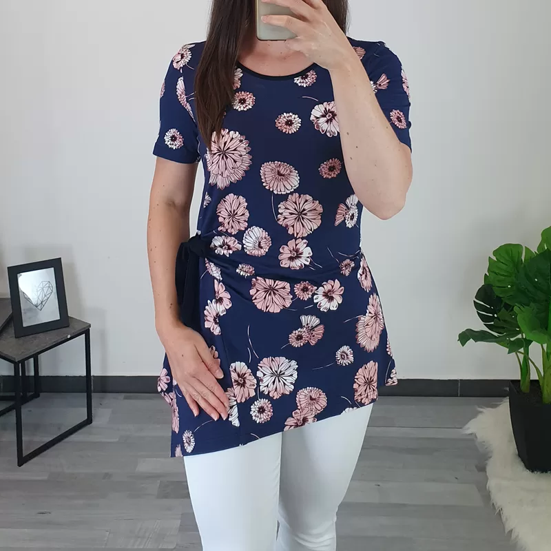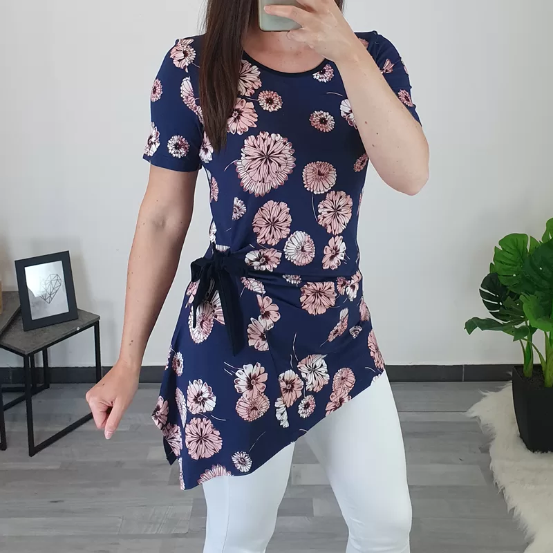 Modna ženska tunika Sava je v osnovi v temno modri barvi, cvetlični vzorec pa je sestavljen iz različnih odtenkov roza barve. Ima kratka rokava, kroj je asimetričen, na levi sprednji strani pa je dodan temno moder trak, s katerim tuniko stisnete. Pentlja ji daje zanimiv izgled. Izdelana je iz kvalitetne mešanice viskoze in elastana. Na voljo je od številke 38 do 50.