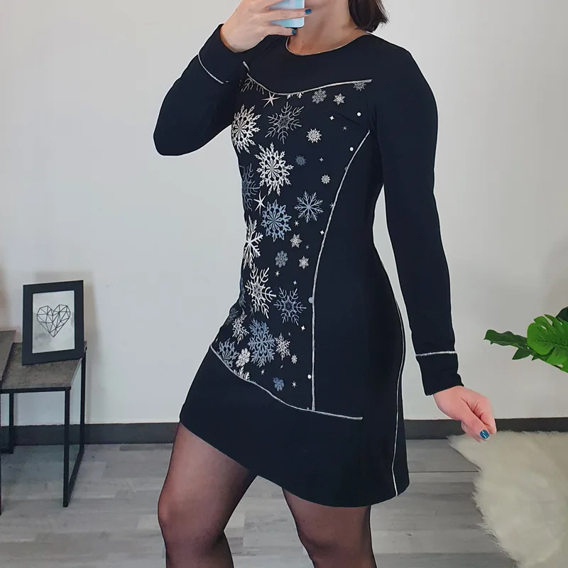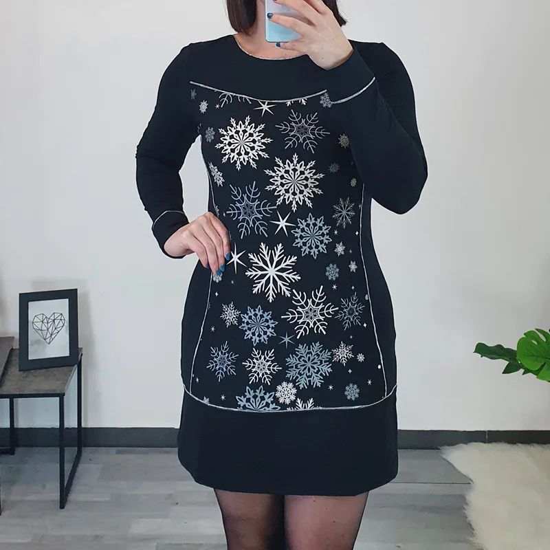 Modna ženska tunika Snežka v črni barvi. Tunika ima dolga rokava in je krojena rahlo navzven. Na sprednji in zadnji strani ter po rokavih jo krasijo srebrni trakovi. Na sprednji strani je dodan še tisk snežink, kar ji daje prazničen izgled.