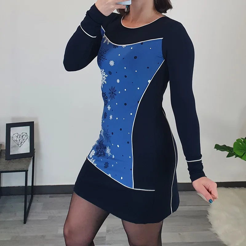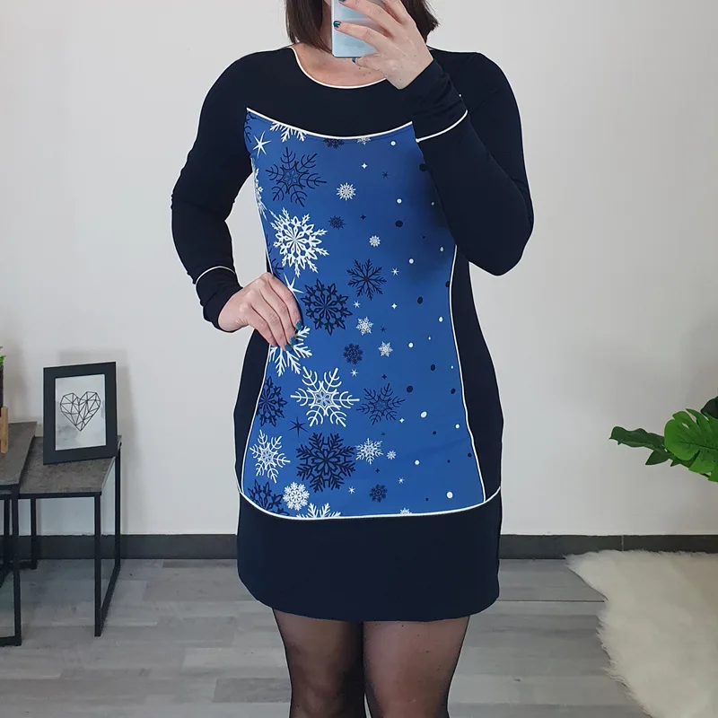 Modna ženska tunika Snežka v kombinaciji temno modre in modre barve. Tunika ima dolga rokava in je krojena rahlo navzven. Na sprednji in zadnji strani ter po rokavih jo krasijo beli trakovi. Na sprednji strani je dodan še tisk snežink, kar ji daje prazničen izgled.
