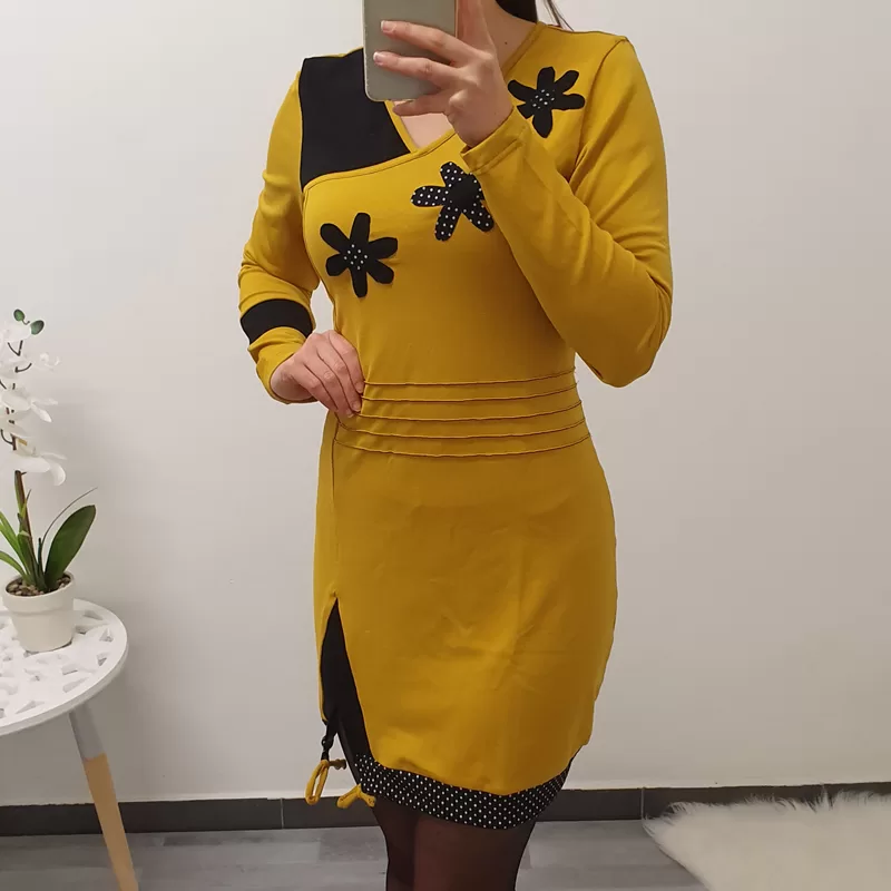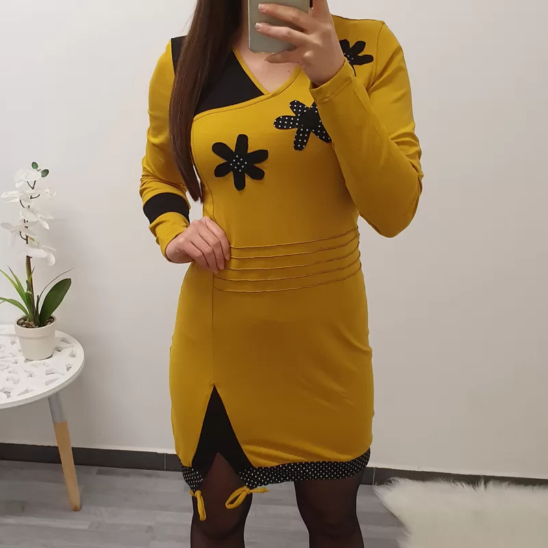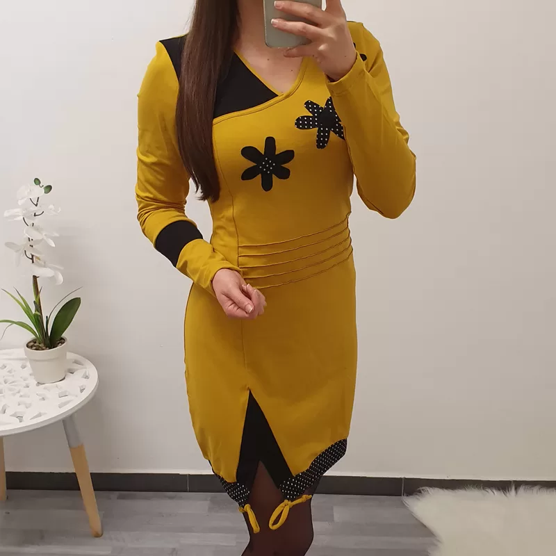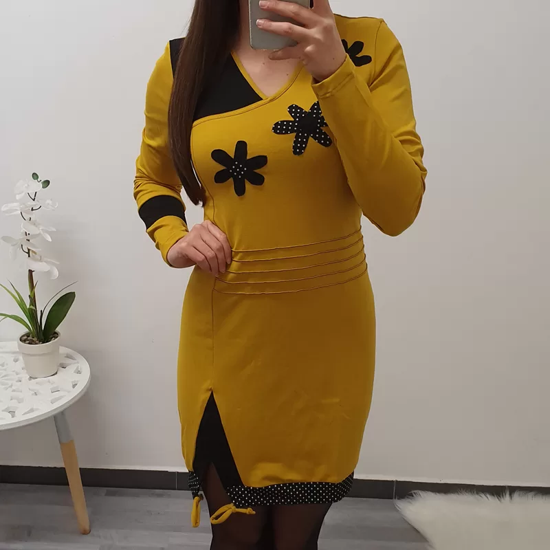 Tunika Stela v gorčično rumeni barvi s črno. Tunika ima ‘V’ izrez, krasijo ga rože.