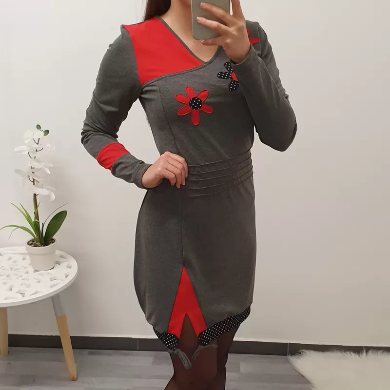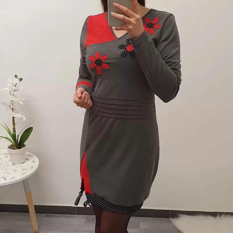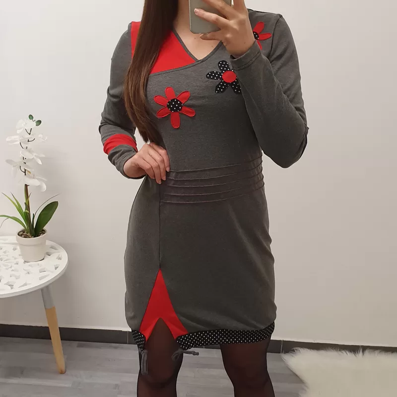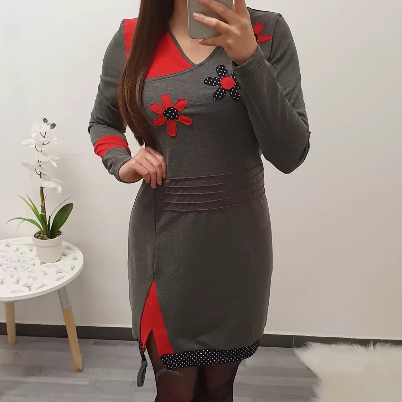 Tunika Stela v sivi barvi barvi z rdečo. Tunika ima ‘V’ izrez, krasijo ga rože.