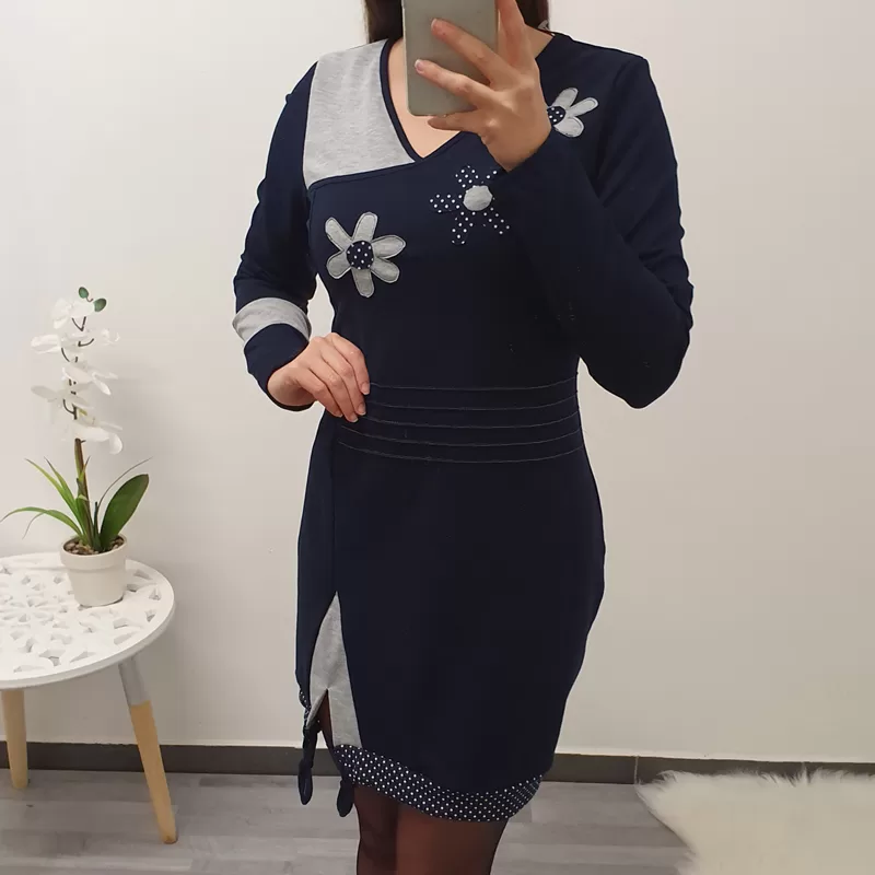 Tunika Stela v temno modri barvi barvi s sivo. Tunika ima ‘V’ izrez, krasijo ga rože.