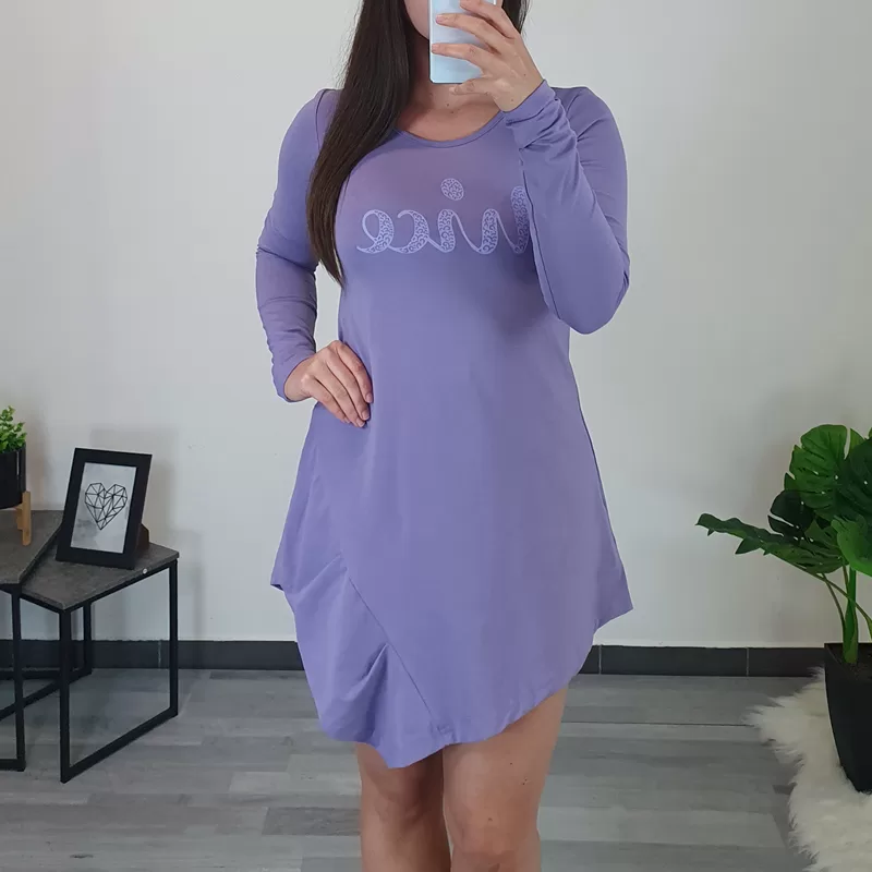 Modna bombažna tunika Tagica v svetlo vijolični barvi. Tunika je narejena iz kvalitetnega bombaža, ki ob nošenju obdrži svojo obliko. Je asimetričnega kroja in ima dolga rokava. Na voljo je od številke 36 do 48.