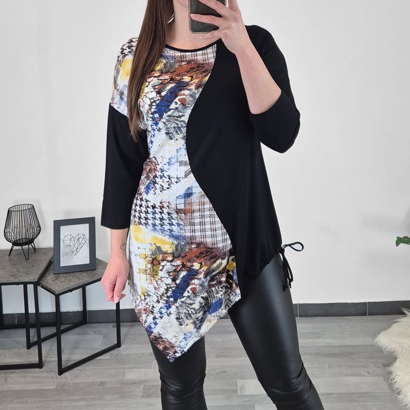Modna ženska tunika v črni barvi. Tunika ima dolga rokava in je asimetrične oblike, kar ji daje zanimiv izgled. Na koncu je dodana vrvica, s katero prilagodite širino in obliko. Na levi strani tunike – spredaj in zadaj – je dodano pisano blago. Tunika je izdelana iz bombaža in je prijetna za nošenje. Na voljo je od številke 36/38 do 44/46.