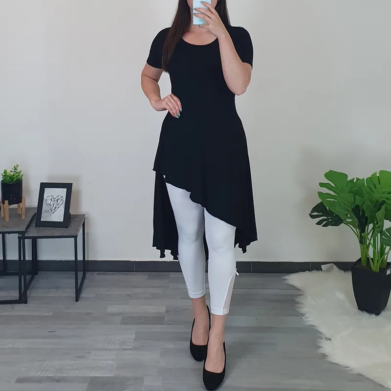 Poletna viskozna tunika Talia v črni barvi. Tunika ima kratka rokava, posebno zanimiv izgled pa ji daje asimetrični kroj, ki je spredaj krajši, zadaj pa daljši. V predelu prsi je oprijeta, nato pa je krojena rahlo navzven. Izdelana je iz kakovostne viskoze in je zelo prijetna za nošenje. Na voljo od številke 38 do 48.