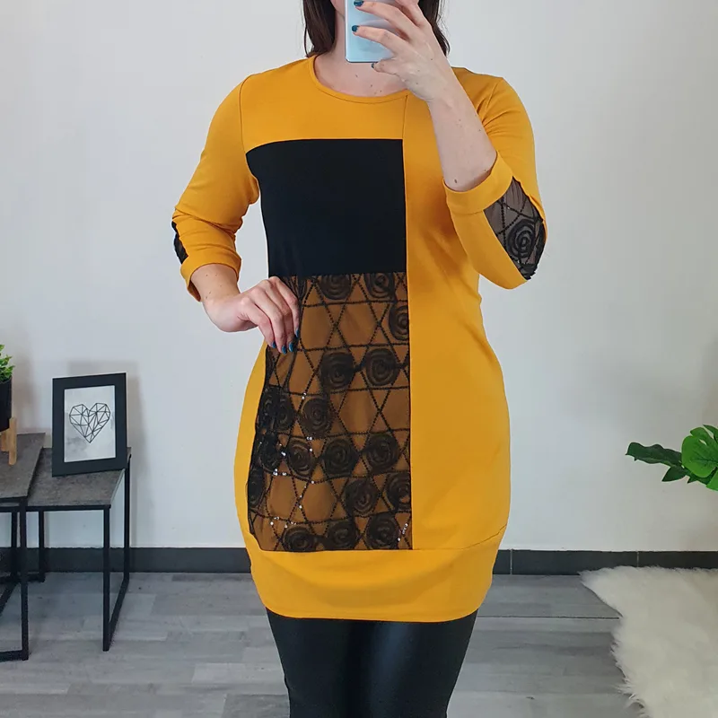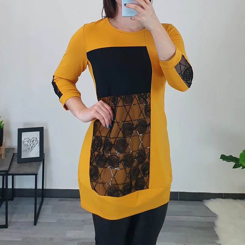 Modna tunika Tami v rumeni barvi. Tunika ima 3/4 rokava in je krojena rahlo na balon. Kombinirana je s črno čipko s cvetličnim vzorcem.