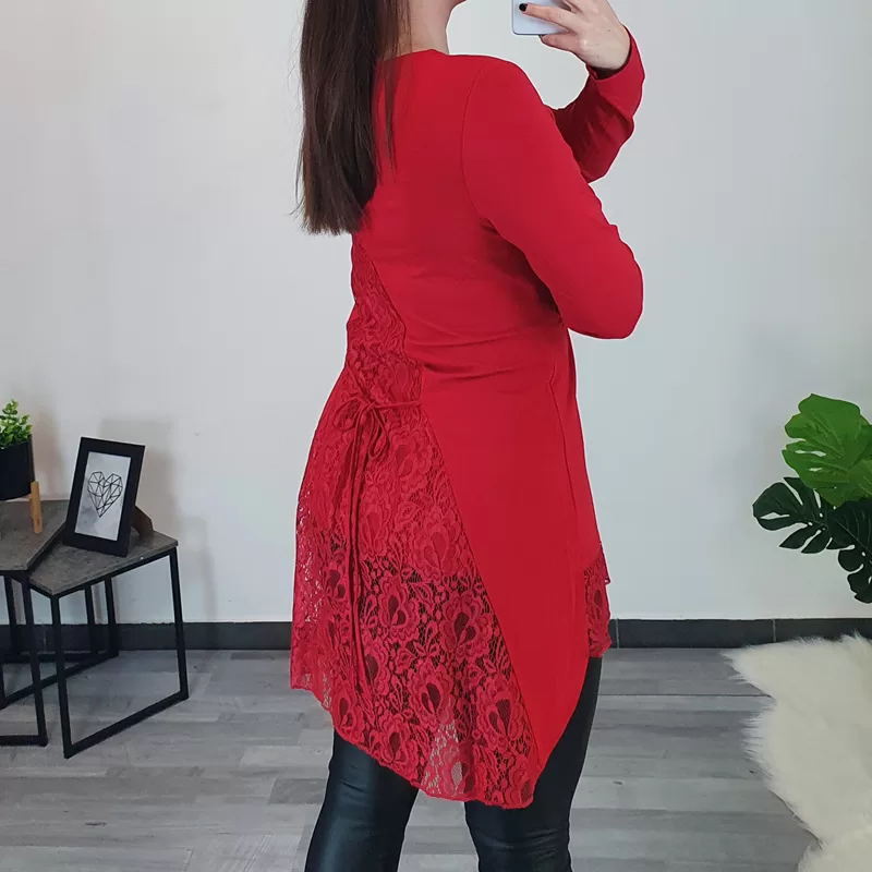 Modna tunika Viki v rdeči barvi. Tunika ima dolga rokava, v predelu prsi je oprijeta, nato pa krojena navzven. Zadnji del tunike je podaljšan in lepo pokrije zadnjico. Na zadnji strani je kombinirana z rdečo čipko, dodan je tudi trak, ki ga zavežete in z njim tuniko oblikujete.