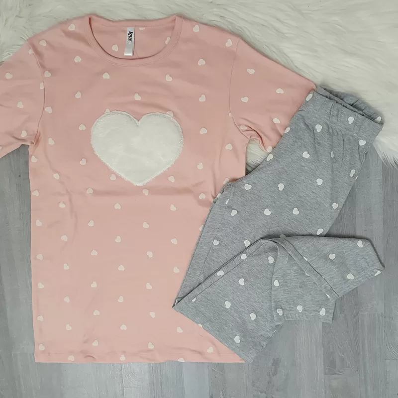 Ženska pižama 37799 z dolgimi rokavi in hlačami. Zgornji del je v nežno roza barvi s srčki, na sredini je prišito večje kosmateno srce v beli barvi. Spodnji del ima patent in je v sivi barvi z belimi srčki.